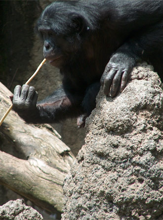 It has long been observed that apes are elementary tool makers and users. Chimpanzees will use their teeth or hands to obtain, shape and size twigs and branches for multiple uses. They might use them as sticks or clubs, for dipping into a nest to obtain ants, for bee killing and honey fishing, or for brain, eye and bone marrow eating. They will pound nuts with clubs or stones to extract kernels and have been seen using leaves as cleaning tools. Bonobos, in captivity at least, have been seen making flake tools to use for chopping, drilling, digging and unearthing food.