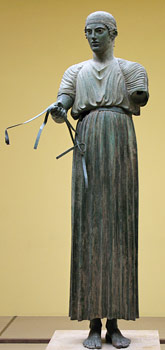 The Charioteer of Delphi, Delphi Archaeological Museum. One of the greatest surviving works of Greek sculpture, dating from about 470 BCE Part of a larger group of statuary given to the Sanctuary of Apollo at Delphi by Polyzalos, brother of the tyrant of Syracuse, this bronze in the Early Classical style is one of the few Greek statues to retain its inlaid glass eyes.