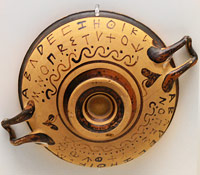 From the Phoenicians, the Greeks took the written pictograms of words like alef and bet that meant “ox” and “house” and simply kept the sound: alef (alpha) = the sound A, bet (beta) = the sound B, etc. Thus, in 725 BCE when writing comes back to the Greeks, it is no longer Linear B of the Greek Mycenaean period, but what we now know as the “alphabet.” This was probably one of the greatest developments that contributed to modern thinking. For the first time in history the elements of writing were decoupled from their meaning, so that using only 24–27 phonetic letters combined into any number of meaningful units, the Greeks were able to write about everything they saw, experienced and thought of in their own language.