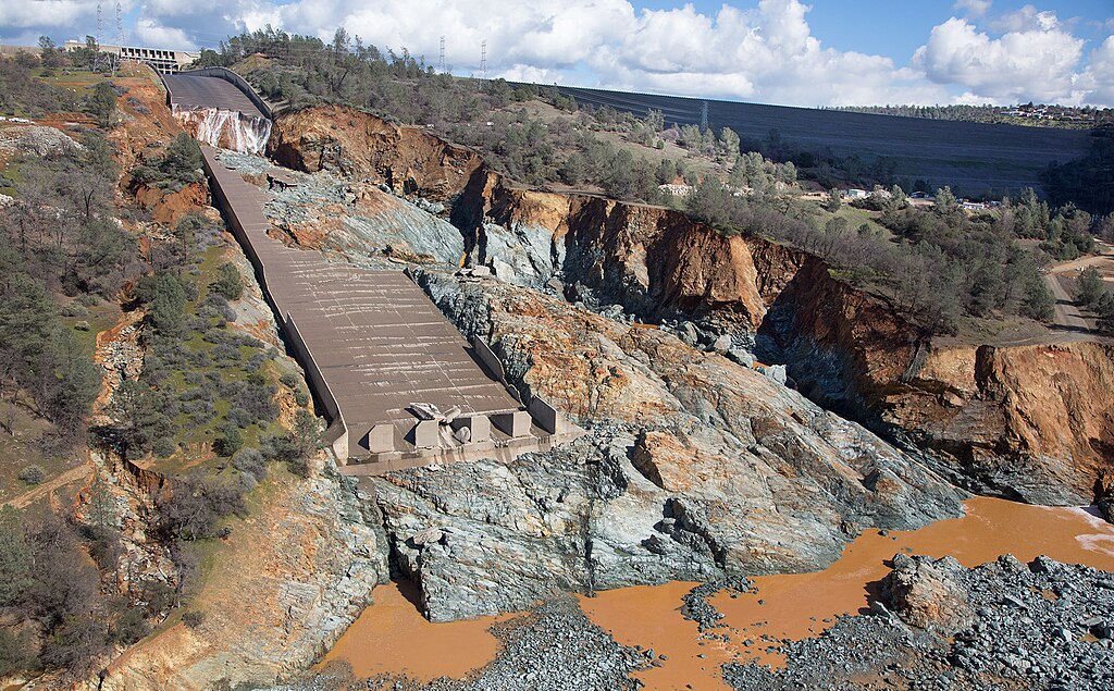 The spillway of the dam in Oroville California collapsed after a period of unusually heavy rains in 2017. (California Dept of Water Resource via Wikimedia Commons)
